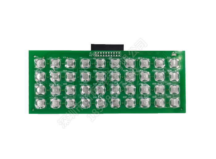 PCB薄膜開關的特點是取材便,工藝穩定,阻值低,并可在其背面直接焊接電路中的某些組件。在面積不大的情況下,可省去硬質襯板層。PCB可做0.5mm-3.0mm的厚度,PCB薄膜開關一般都采用金屬導片作為導通迷宮觸點,故較好的手感。所不利的方面,是在整機中裝聯不及軟性薄膜開關方便,往往需要焊接連接器并通過扁平電纜將引線引出。硬性薄膜開關的信息反饋除蜂鳴信號、LED指示外,普遍可采用金屬手感彈片。